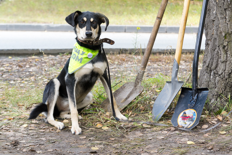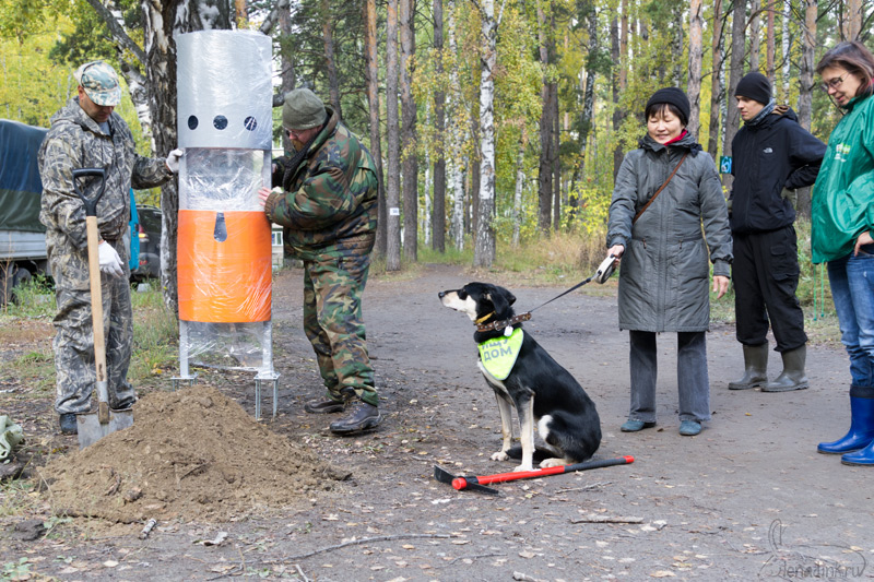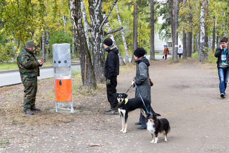 И вот мы, волонтёры добрых дел, Кирилл, Александр, Лариса, я и представители собачьего сообщества Городка шелти Винки и дворняжка Дора, стоим на университетском кольце и помогаем устанавливать первые догбоксы Городка. А если по-научному, то «устройства для сбора продуктов жизнедеятельности собак».